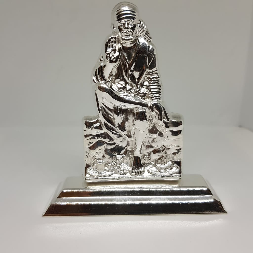 Sterling silver Shirdi Sai baba Idol. Ideal for daily puja use. Excellent statue for home temple and will last forever. Excellent gift / return gift item for remembrance and keeping it for forever. Purity of Silver is guaranteed and stamped. Color, weight and dimension are for indication of product details and may slightly differ from the original product. Approx Dimensions: W x H = 8.5 cm x 9.5 cm WT: 42gms